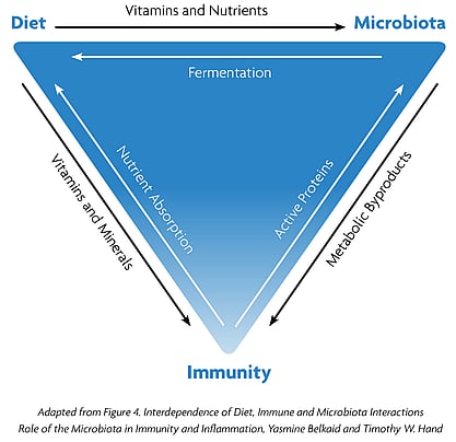 There is also a strong interdependence between diet, immune system and commensal bacteria. Diet can have a very important influence on the immune system, and the immune system can also affect nutrient uptake. Diet also has a dominant influence on the composition of commensal bacteria, which also influences nutrient absorption.